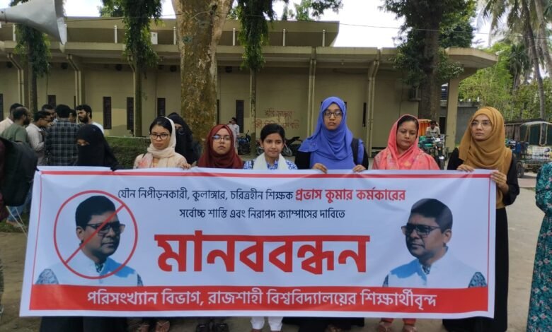 রাবির পরিসংখ্যান বিভাগের যৌন নিপীড়ক শিক্ষকের সর্বোচ্চ শাস্তির দাবিতে মানববন্ধন